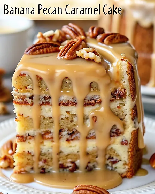 This Banana Pecan Caramel Layer Cake combines the comfort of banana bread with the elegance of a layered celebration cake.