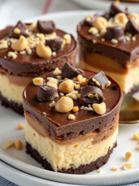 Indulge in creamy chocolate peanut butter cheesecake bars with Oreo crust! Perfect handheld dessert for parties or special occasions. Try today!