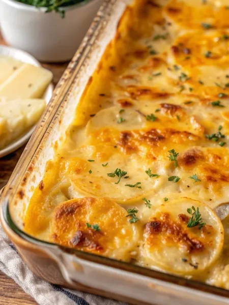 Creamy garlic potatoes au gratin with crisp edges and melted cheddar. Crowd-pleasing comfort food perfect for holidays! Get recipe today.