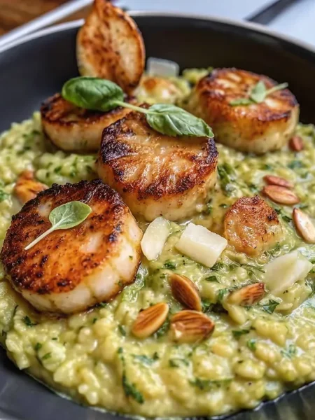 Indulge in this creamy basil risotto topped with perfectly seared sea scallops. A restaurant-quality meal you can create at home. Try today!