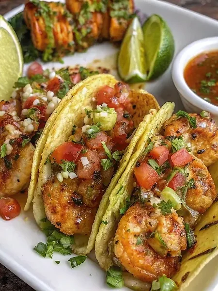 Try these spicy shrimp tacos with creamy garlic cilantro lime slaw! Ready in 30 minutes with fresh ingredients. Perfect for dinner. Get the recipe now.