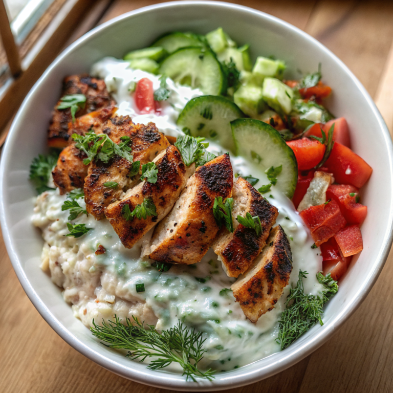 The inspiration for these Chicken Tzatziki Bowls came from observing the natural color harmony of a Mediterranean sunset – those soft whites of clouds, golden warmth of late afternoon light, and deep emerald shadows. I wanted to capture that same peaceful, organic beauty in a dish that felt both nourishing and visually striking. The geometric arrangement of ingredients mirrors the clean lines of Greek architecture, while the organic shapes of fresh herbs soften the composition like wildflowers growing between ancient stone paths. This visual design philosophy transforms simple, wholesome ingredients into an artful presentation that honors both tradition and modern aesthetic sensibilities.