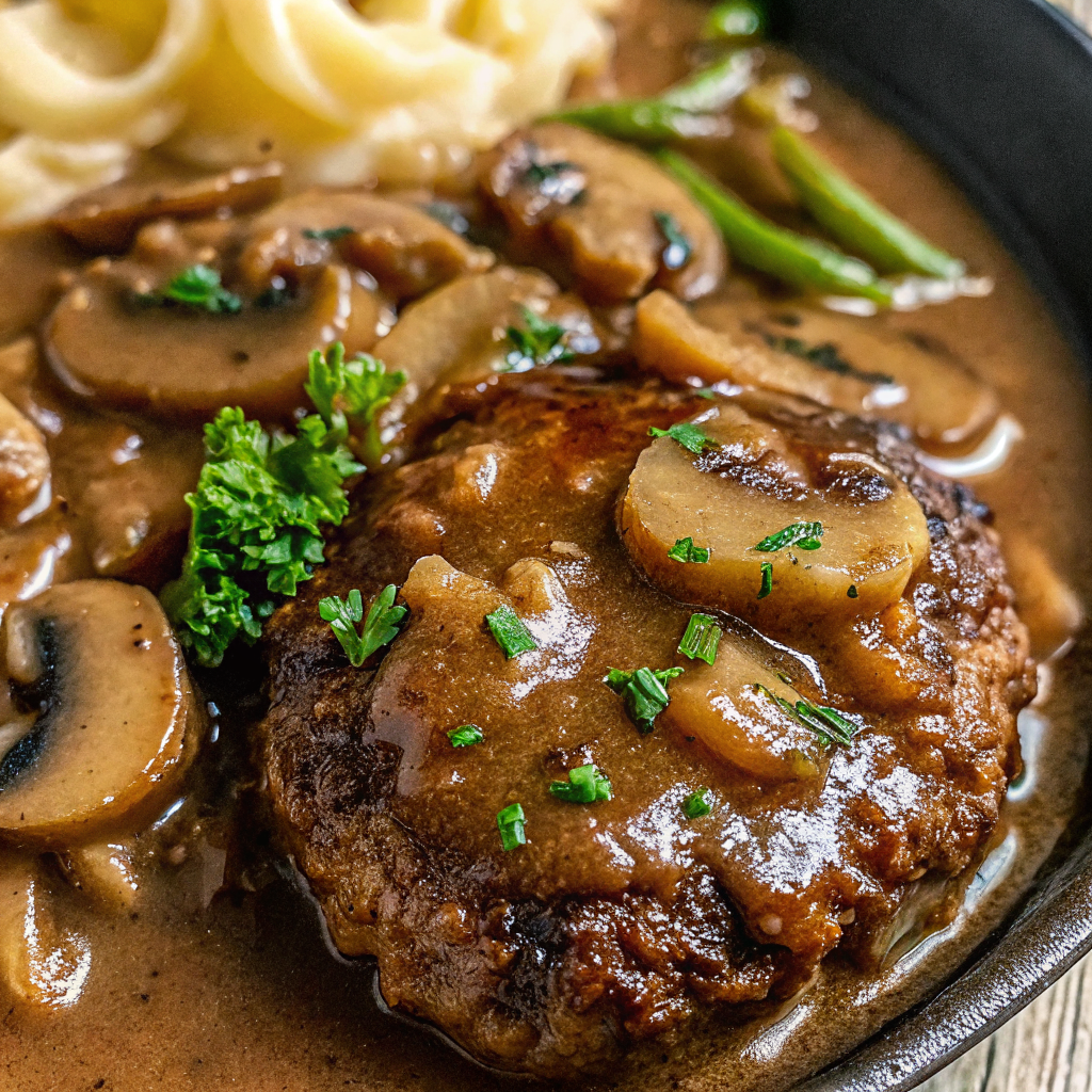 Present your Homemade Salisbury Steak on warmed white plates to showcase the rich colors. Create height by mounding mashed potatoes in the center, then lean the patty against this foundation. Spoon gravy in an elegant pool around the base, ensuring mushrooms and onions are visible. Garnish with a single sprig of fresh herbs placed at a diagonal for professional polish. Use wide, shallow bowls for a more contemporary presentation, or classic dinner plates for traditional appeal. Consider the lighting—warm, soft illumination enhances the golden-brown tones beautifully.