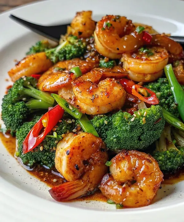 Per serving: Approximately 285 calories, 28g protein, 22g carbohydrates, 12g fat, 3g fiber. This dish provides excellent lean protein from shrimp, essential vitamins from broccoli including vitamin C and folate, plus beneficial antioxidants from garlic and ginger.