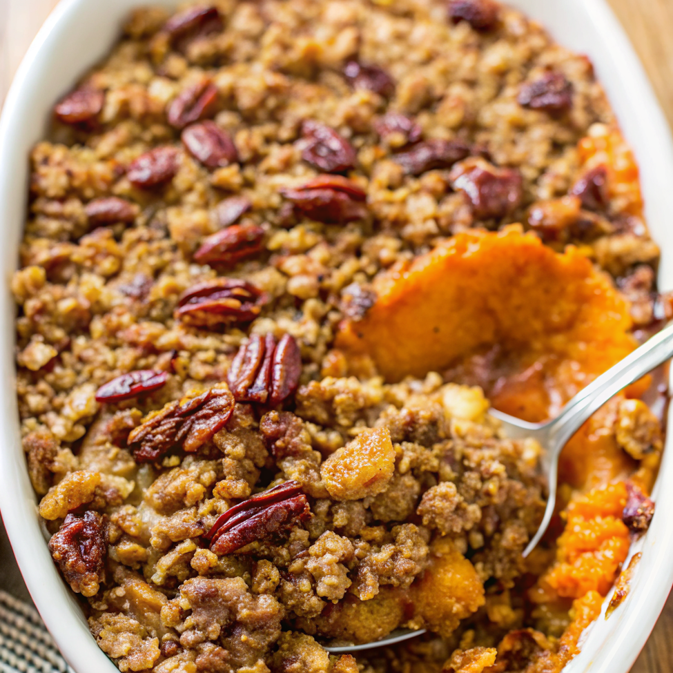 A comforting Sweet Potato Casserole featuring a creamy, spiced sweet potato filling topped with a delightful butter pecan crumble, perfect for any occasion.